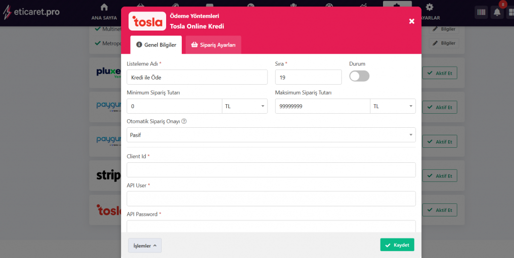 “Araçlar -> Ödeme Yöntemleri” sayfasından aktif edebilirsiniz.
