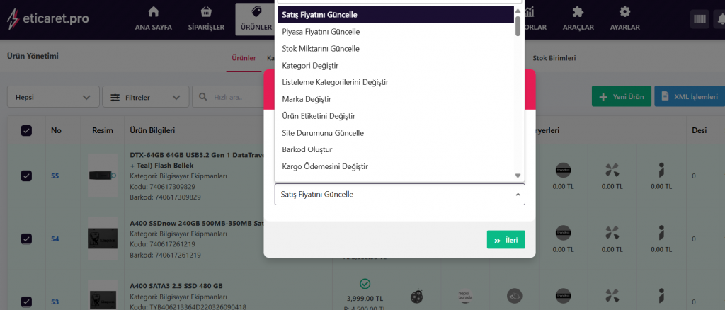 Ürün yönetiminde yer alan ürün listeleme tablosunda, daha önce yalnızca sınırlı işlemler yapılabiliyordu (kategori değiştirme, marka değiştirme vb.). Yapılan güncelleme ile birlikte toplu ürün güncelleme sayfasında bulunan tüm işlemler, artık ürün listeleme tablosundan ürünler seçilerek de gerçekleştirilebilir.