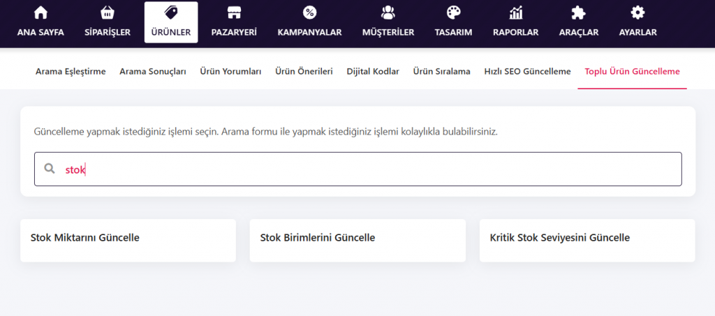 Toplu ürün güncelleme işlemlerine stok güncelleme özelliği eklenmiştir. Ürünlerin stok miktarları toplu olarak güncellenebilir, artırılabilir veya azaltılabilir.