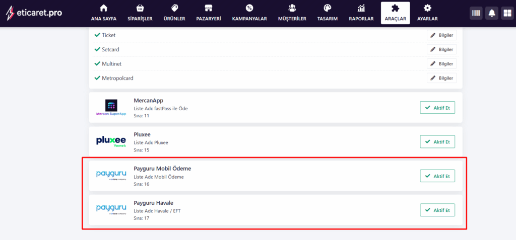 Araçlar -> Ödeme Yöntemleri” sayfasından aktif edebilirsiniz.