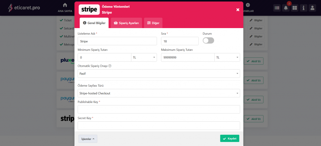 Bu entegrasyon ile birlikte ödemeler hem iframe (sayfa içi ödeme) yöntemiyle hem de Stripe Hosted Checkout Page üzerinden alınabilir.