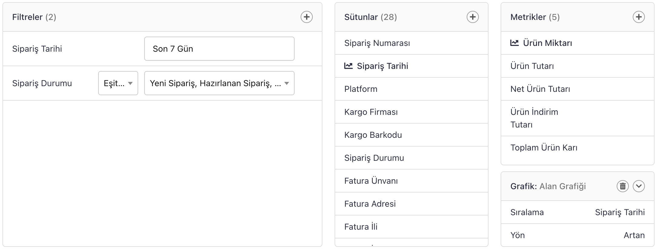 Rapor türüne bağlı sütunlar ve metrikler üzerinden filtreleme yapılabilir. Örneğin; tarih aralığı, ürün kategorisi, kampanya bilgisi, müşteri grubu gibi kriterler seçilebilir. - Sütunlar:
